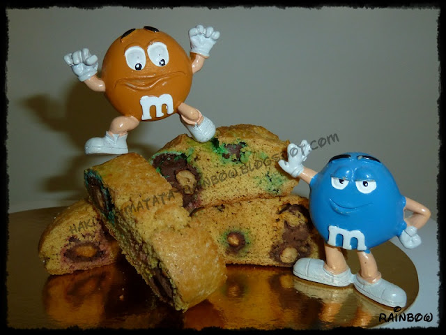 Ho trovato questa buonissima ricetta nel blog "Bperbiscotto". Li ho chiamati così perchè il procedimento è lo stesso dei classici cantucci. Montare con le fruste elettriche il burro d'arachidi con lo zucchero, aggiungere un uovo alla volta, quando sarà amalgamato per bene, aggiungerne un altro fino ad esaurimento (sempre utilizzando le fruste). Aggiungere al composto un pizzico di sale, la farina e il lievito, mescolare con una forchetta aggiungere gli M&M's, rovesciare l'impasto su un piano infarinato e impastare con le mani, fino ad ottenere un bell'impasto omogeneo. Dividerlo in quattro e con ogni parte formare dei filoni lunghi quanto la leccarda del forno, posizionarne due per stampo (precedentemente ricoperto con carta da forno) spennarlarlli con un pò di latte e distribuire sulla superficie un pò di zucchero. Infornare a 200° per 20/25 minuti. Appena usciti dal forno farli rapprendere per 2 minuti, poi tagliarli a fettine spesse un dito e posizionarli di nuovo sulla leccarda, infornare per altri 10 minuti da un lato e altri 10 dall'altro abbassando un pò il forno a 180°. Farli raffreddare e eccoli pronti. Come gli M&M's possono creare dipendenza!!