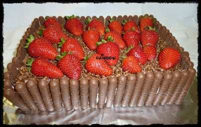 Partiamo preparando le due creme. Montare per pochissimi minuti il mascarpone con le fruste e aggiungerci il latte condensato, mescolare per bene con un cucchiaio di legno. Fatta! Passiamo alla seconda. Sciogliere un pochino la nutella a bagno maria in modo da riuscire a lavorarla meglio, in una ciotola sbriciolare i due tronky, aggiungere la nutella, le nocciole tritate e la panna, mescolare molto bene per far sì che gli ingredienti siano ben amalgamati. Iniziamo a comporre! Strato di sfoglia, bagnato con acqua e amaretto, poi tutta la crema rocher, di nuovo sfoglia bagnata, poi tutta la crema al mascarpone e ultimare con la sfoglia sempre baganata. Montare il dolce neve con il latte freddo fino ad ottenere una bella panna montata e ricoprire tutta la torta anche sui lati. Distribuore i bastoncini su tutto il perimetro della torta, cospargere la superficie con il riso soffiato e adagiarci sopra le fragole (lavate mi raccomando).
