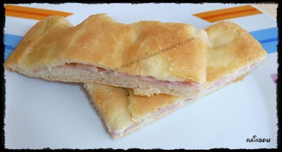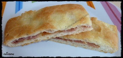Impastare per bene tutti gli ingredienti (quelli della prima lista) formare una palla, farci una croce sopra e mettere a lievitare coperto per 2 ore. Dividere l'impasto a metà, infarinare per bene la spianatoia e iniziare stendendone una col mattarello, la forma dev'essere il più rotondo possibile, mentre lo spessore sottile sottile. Farcire fino a metà con il prosciutto cotto e una sottiletta, richiudere sollevando l'altra metà e schiacciare col mattarello. Mettere su una teglia e lasciare riposare per 30 minuti. (usare due teglie, anche perchè vengono abbastanza grandi) Fare la stessa cosa con l'altra metà d'impasto. Trascorso il tempo, con i polpastrelli delle dita formare delle fossette sulle focacce. Praparare l'emulsione di acqua e olio, e versarlo sulle focacce aiutandosi a spargerlo bene con le mani, salare e infornare a forno già caldo a 180° per 25 minuti, o comunque fino a doratura. Tagliare a striscioline e servire.