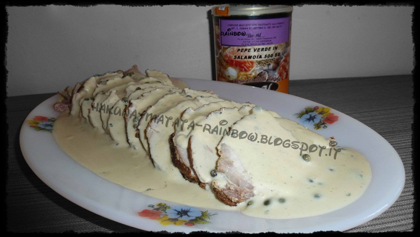 frattempo, mettere in un contenitore alto il fondo di cottura e frullarlo con il minipimer unendo la panna e la salvia, alla fine senza tritarlo aggiungere il pepe verde. In un piatto da portata mettere sul fondo un pò di crema, le fettine di carne (tagliate non troppo spesse) e ancora