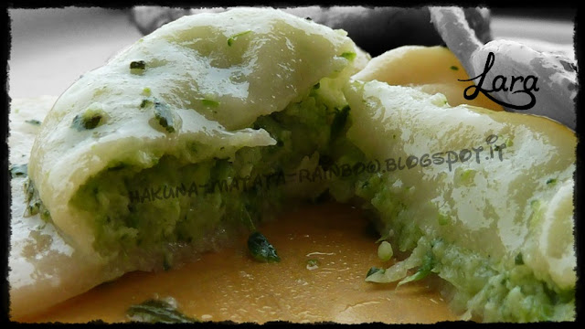 congelato. Prendere il broccolo congelato e cuocerlo a vapore per qualche minuto, metterlo nel bicchiere del minipimer e frullarlo, versarlo in una ciotola e aggiungerci lo scalogno precedentemente inumidito con l'acqua, il formaggio, la ricotta, il sale e il pepe, mescolare per bene finchè tutti gli ingredienti non saranno ben amalgamati, poi per comodità io ho messo tutto il ripieno nel sac-a-poche. Riprendere la pasta e aiutandosi con la sfogliatrice tirare la pasta non troppo sottile (io con il Kitchen sono arrivata al 4) dividere la sfoglia in due, prendere bene le distanze (io anche se perdo un pò di tempo per far le cose fatte bene, con lo stampino segno leggermente la pasta) e distribuire il ripieno, con l'altra sfoglia