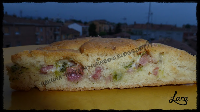 Per prima cosa cuocere il broccolo a vapore, poi tagliarlo a pezzetti e farlo raffreddare, cuocere la pancetta in una padella antiaderente senza l'aggiunta di grassi e poi lasciarla reffraddare il tempo di fare l'impasto poi mescolarla assieme ai broccoli. Nella ciotola dell'impastatrice, mettere tutti gli ingredienti in polvere e mescolare, poi aggiungere i liquidi e impastare con in gancio K (quello ad uncino) finchè l'impasto non si sarà incordato e staccato per bene dalle pareti, rovesciarlo sulla spianatoia infarinata e lavoralo un pò con le mani, (a questo punto accendete il forno a 200°) dividere l'impasto in due parti più o meno uguali e stenderlo con le mani unte sulla leccarda ricoperta di carta da forno, dandogli all'incirca una forma arrotondata, guarnire tutta la superficie con la pancetta e i broccoli e le sottilette spezzettate lasciando un pò di bordo per poi sigillare, chiudere con l'altra metà di impasto. Ungere tutta la superficie con l'olio e cospargere con il sale affumicato. Infornare sempre a 200° e cuocere per 30 minuti. Farla raffreddare per almeno una decina di minuti su una grata. Buonissima, calda, tiepida, fredda il giorno dopo e addirittura riscaldata e tagliatata a cubettini per un aperitivo. Si può portare benissimo anche ad un pic nic.