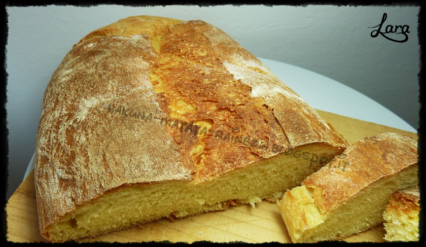 Si può impastare tranquillamente anche a mano, ma io per comodità questa voltà l'ho impastato con la planetaria. Versare tutti gli ingredienti nella ciotola della planetaria e impastare con il gancio K (quello ad uncino) e continuare a lavorare finchè l'impasto non sarà ben incordato (le pareti della ciotola dovranno essere belle pulite), rovesciare l'impasto sulla spianatoia infarinata e lavorare ancora per qualche minuto, formare una palla, infarinarla e metterla nella ciotola a lievitare nel forno spento per 1 ora. Trascorso il tempo, fare un giro di pieghe e se decidete di fare due pagnotte formate due palle e mettetele distanziate sulla leccarda ricoperta con carta da forno e infarinatele, se invece decidete come me di farne una sola, fate un filone non troppo sottile e mettetelo in diagonale sulla leccarda ricoperta con carta da forno e infarinatelo fare lievitare per altre 2 ore. Trascorso il tempo con una lametta incidere la superficie della pagnotta e aiutandovi con le mani e con le setole di un pennello da cucina spruzzate sulla pagnotta un pò d'acqua (farà venire una crosticina super croccante) infornare in forno già caldo a 200° per 30/40 minuti. Dev'essere bello dorato, farlo raffreddare su una gratella, buonissimo anche nei giorni seguenti.
