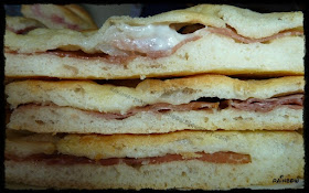 Impastare per bene tutti gli ingredienti (quelli della prima lista) formare una palla, farci una croce sopra e mettere a lievitare coperto per 2 ore. Dividere l'impasto a metà, infarinare per bene la spianatoia e iniziare stendendone una col mattarello, la forma dev'essere il più rotondo possibile, mentre lo spessore sottile sottile. Farcire fino a metà con il prosciutto cotto e una sottiletta, richiudere sollevando l'altra metà e schiacciare col mattarello. Mettere su una teglia e lasciare riposare per 30 minuti. (usare due teglie, anche perchè vengono abbastanza grandi) Fare la stessa cosa con l'altra metà d'impasto. Trascorso il tempo, con i polpastrelli delle dita formare delle fossette sulle focacce. Praparare l'emulsione di acqua e olio, e versarlo sulle focacce aiutandosi a spargerlo bene con le mani, salare e infornare a forno già caldo a 180° per 25 minuti, o comunque fino a doratura. Tagliare a striscioline e servire.